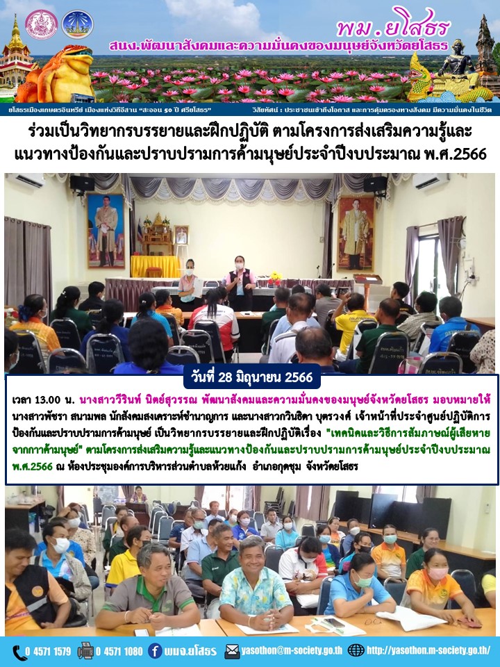 วันที่ 8 ก.ค. 2566 (13:57 น.)วันที่ 28 มิถุนายน 2565 เวลา 13.00 น. นางสาววีรินท์ นิตย์สุวรรณ พัฒนาสังคมและความมั่นคงของมนุษย์จังหวัดยโสธร มอบหมายให้ นางสาวพัชรา สนามพล นักสังคมสงเคราะห์ชำนาญการ และนางสาวกวินธิดา บุตรวงศ์ เจ้าหน้าที่ประจำศูนย์ปฏิบัติการป้องกันและปราบปรามการค้ามนุษย์ เป็นวิทยากรบรรยายและฝึกปฏิบัติเรื่อง "เทคนิคและวิธีการสัมภาษณ์ผู้เสียหายจากกาาค้ามนุษย์" โครงการส่งเสริมความรู้และแนวทางป้องกันและปราบปรามการค้ามนุษย์ประจำปีงบประมาณ พ.ศ.2566 ณห้องประชุมองค์การบริหารส่วนตำบลห้วยแก้ง อำเภอกุดชุม จังหวัดยโสธร