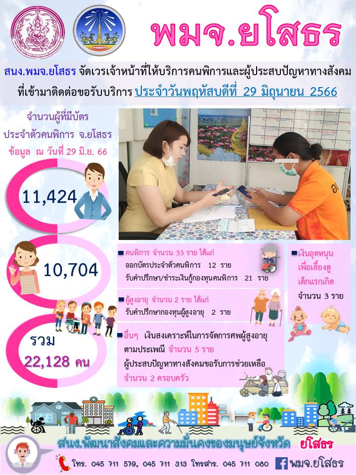 สนง.พมจ.ยโสธร จัดเวรเจ้าหน้าที่ให้บริการคนพิการและผู้ประสบปัญหาทางสังคม ที่เข้ามาติดต่อขอรับบริการ (29 มิถุนายน 2566)