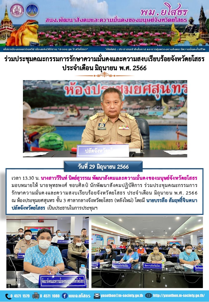 ร่วมประชุมคณะกรรมการ รักษาความมั่นคงและความสงบเรียบร้อยจังหวัดยโสธร ประจำเดือน มิถุนายน พ.ศ. 2566 (29 มิถุนายน 2566)