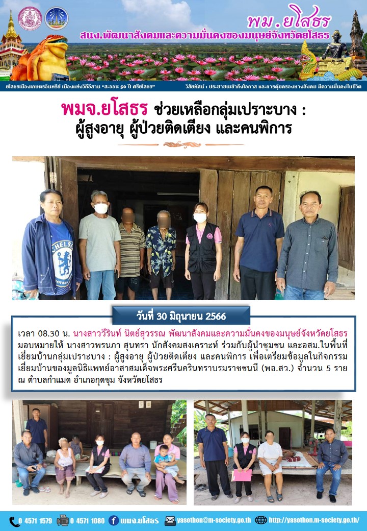 พมจ.ยโสธร ช่วยเหลือกลุ่มเปราะบาง:ผู็สูงอายุ ผู้ป่วยติดเตียง และคนพิการ (30 มิถุนายน 2566)