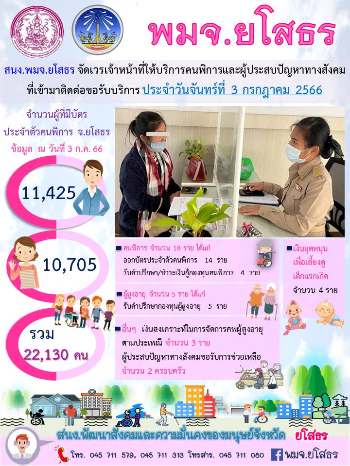 สนง.พมจ.ยโสธร จัดเวรเจ้าหน้าที่ให้บริการคนพิการและผู้ประสบปัญหาทางสังคม ที่เข้ามาติดต่อขอรับบริการ (3 กรกฎาคม 2566)