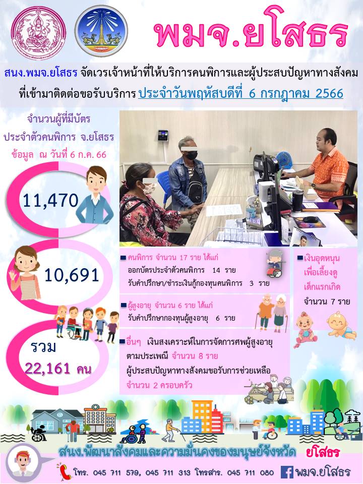 สนง.พมจ.ยโสธร จัดเวรเจ้าหน้าที่ให้บริการคนพิการและผู้ประสบปัญหาทางสังคม ที่เข้ามาติดต่อขอรับบริการ (6 กรกฎาคม 2566)