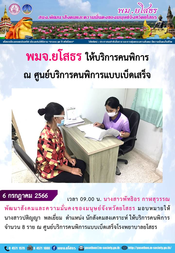 พมจ.ยโสธร ให้บริการคนพิการ ณ ศูนย์บริการคนพิการแบบเบ็ดเสร็จโรงพยาบาลยโสธร (6 กรกฎาคม 2566)