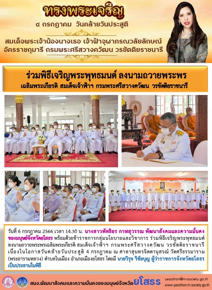 แก้ไขโดย : [สำนักงานพัฒนาสังคมและความมั่นคงของมนุษย์จังหวัดยโสธร] วันที่ 24 ก.ค. 2566 (22:21 น.)วันที่ 6 กรกฎาคม 2566 เวลา 14.30 น. นางสาวพัทธิอร กาฬสุวรรณ พัฒนาสังคมและความมั่นคงของมนุษย์จังหวัดยโสธร พร้อมด้วยข้ าราชการกลุ่มนโยบายและวิชาการ ร่วมพิธีเจริญพระพุทธมนต์ ลงนามถวายพระพรเฉลิมพระเกียรติ สมเด็จเจ้าฟ้าฯ กรมพระศรีสวางควัฒน วรขัตติยร่าชนารีเนื่องในโอกาสวันคล้ายวันประ สูติ 4 กรกฎาคม ณ ศาลาสุนทรจิตตานุสรณ์ วัดศรีธรรมาราม (พระอารามหลวง) ตำบลในเมือง อำเก้อเมืองยโสธร โดยมี นายวิรุจ วิชัยบุญ ผู้ว่าราชการจังหวัดยโสธร เป็นประธานในพิธี