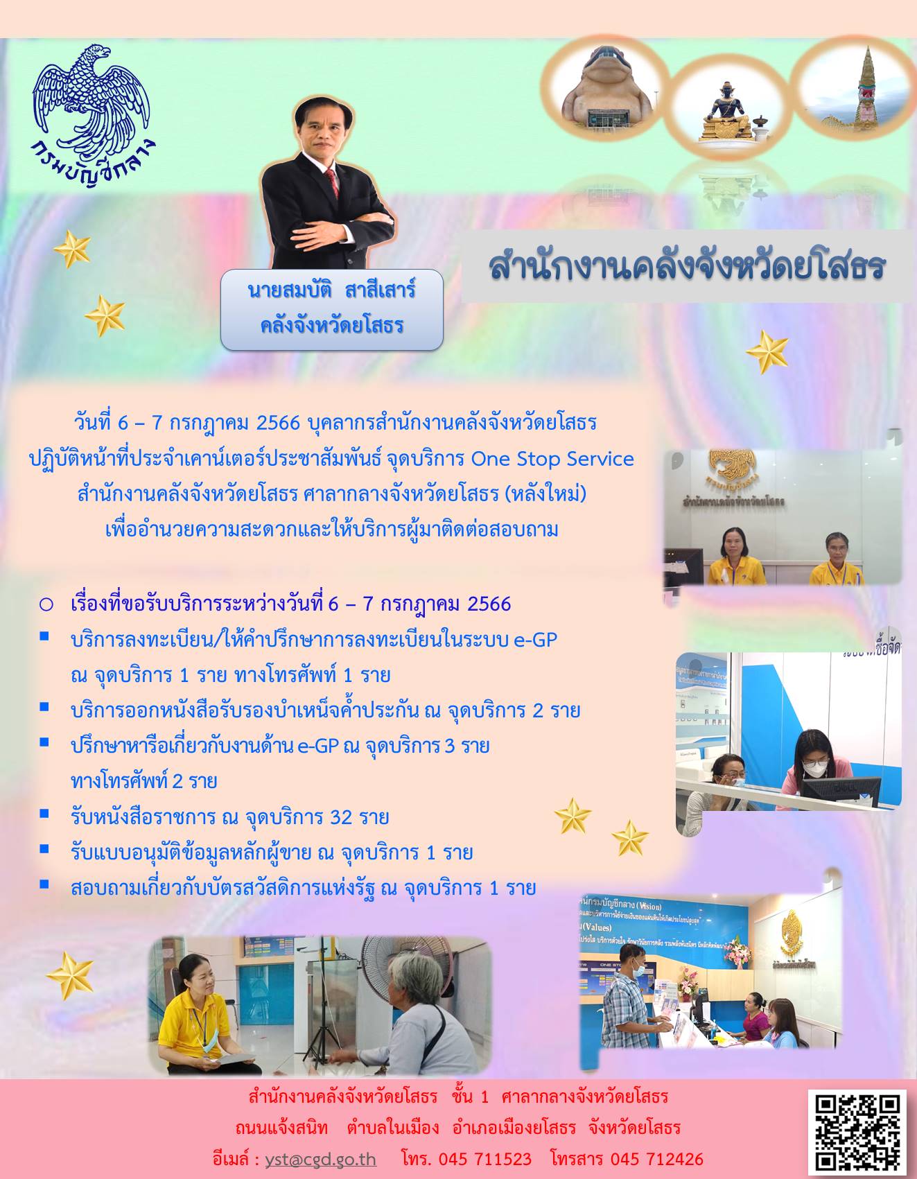 วันที่ 6 – 7 กรกฎาคม 2566 บุคลากรสำนักงานคลังจังหวัดยโสธร ปฏิบัติหน้าที่ประจำเคาน์เตอร์ประชาสัมพันธ์ จุดบริการ One Stop Service สำนักงานคลังจังหวัดยโสธร ศาลากลางจังหวัดยโสธร (หลังใหม่) เพื่ออำนวยความสะดวกและให้บริการผู้มาติดต่อสอบถาม