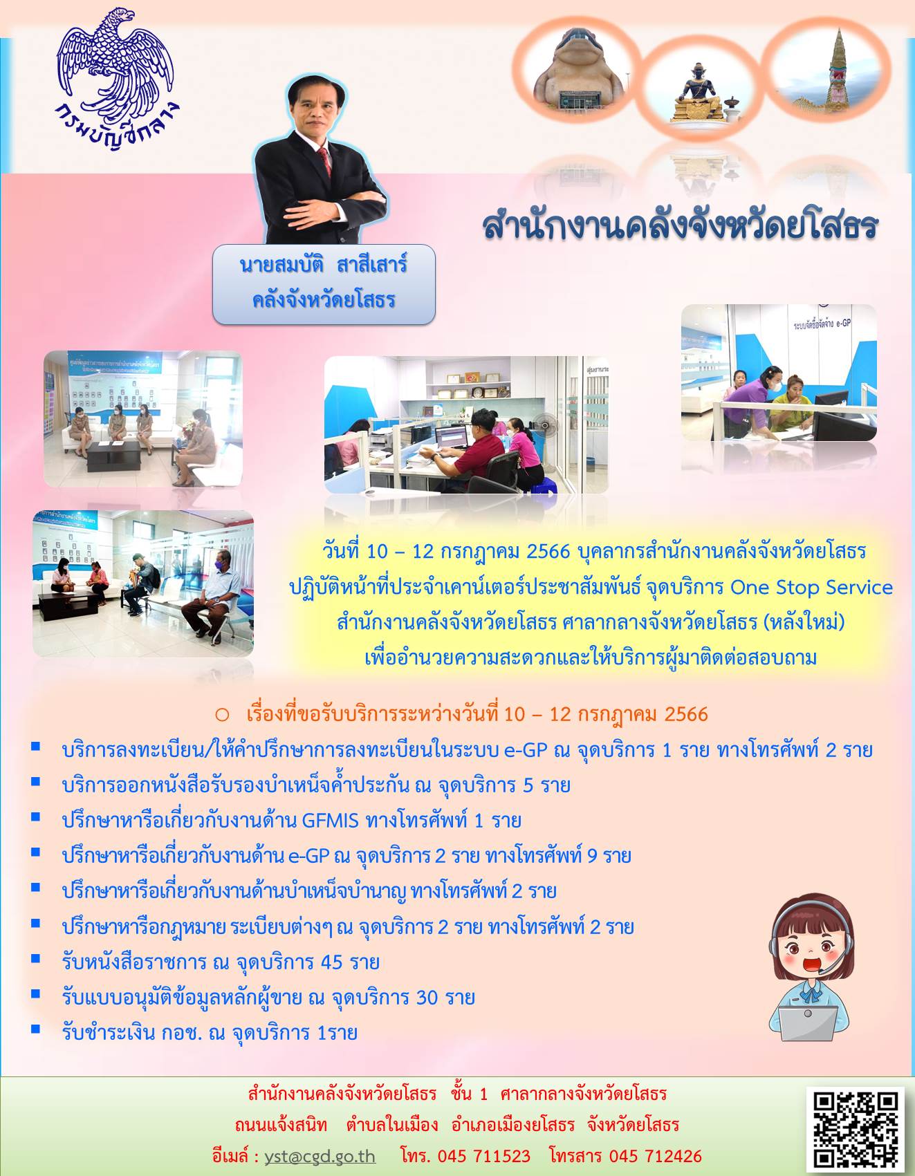วันที่ 10 – 12 กรกฎาคม 2566 บุคลากรสำนักงานคลังจังหวัดยโสธร ปฏิบัติหน้าที่ประจำเคาน์เตอร์ประชาสัมพันธ์ จุดบริการ One Stop Service สำนักงานคลังจังหวัดยโสธร ศาลากลางจังหวัดยโสธร (หลังใหม่) เพื่ออำนวยความสะดวกและให้บริการผู้มาติดต่อสอบถาม