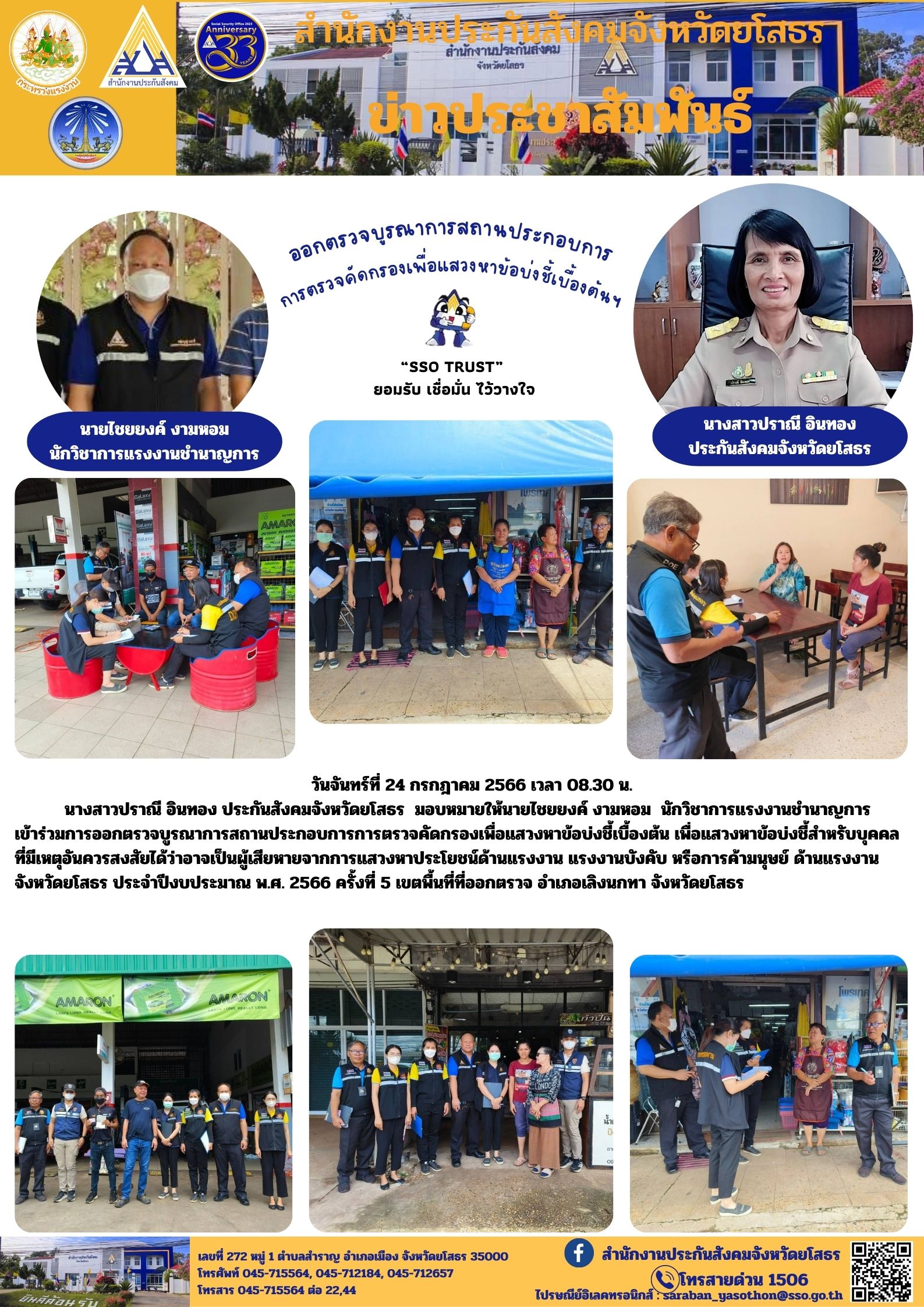 วันจันทร์ที่ 24 กรกฎาคม 2566 เวลา 08.30 น. นางสาวปราณี อินทอง ประกันสังคมจังหวัดยโสธร มอบหมายให้นายไชยยงค์ งามหอม นักวิชาการแรงงานชำนาญการ เข้าร่วมการออกตรวจบูรณาการสถานประกอบการการตรวจคัดกรองเพื่อแสวงหาข้อบ่งชี้เบื้องต้น เพื่อแสวงหาข้อบ