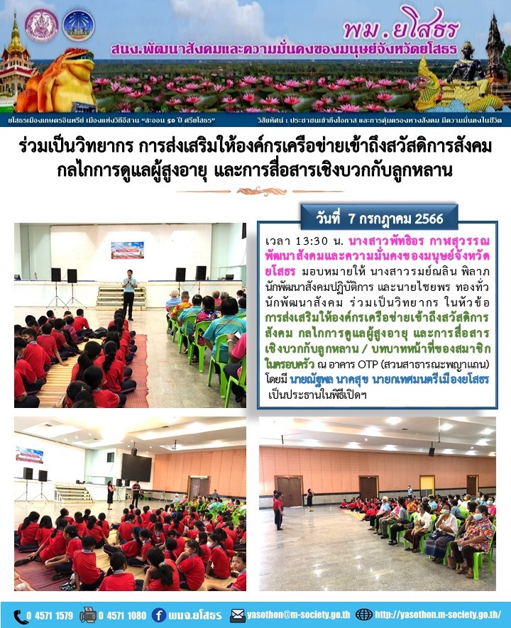 พมจ.ยโสธร ร่วมเป็นวิทยากร ในหัวข้อ การส่งเสริมให้องค์กรเครือข่ายเข้าถึงสวัสดิการสังคม กลไกการดูแลผู้สูงอายุ และการสื่อสารเชิงบวกกับลูกหลาน (7 กรกฎาคม 2566)