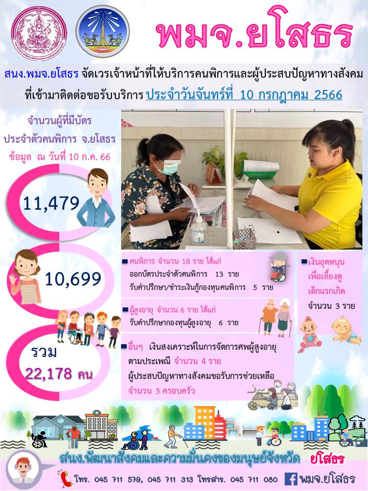 สนง.พมจ.ยโสธร จัดเวรเจ้าหน้าที่ให้บริการคนพิการและผู้ประสบปัญหาทางสังคม ที่เข้ามาติดต่อขอรับบริการ (10 กรกฎาคม 2566)
