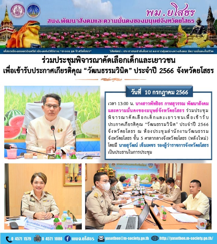 พมจ.ยโสธร ร่วมประชุมพิจารณาคัดเลือกเด็กและเยาวชนเพื่อเข้ารับประกาศเกียรติคุณ "วัฒนธรรมวินิต" ประจำปี 2566 (10 กรกฎาคม 2566)