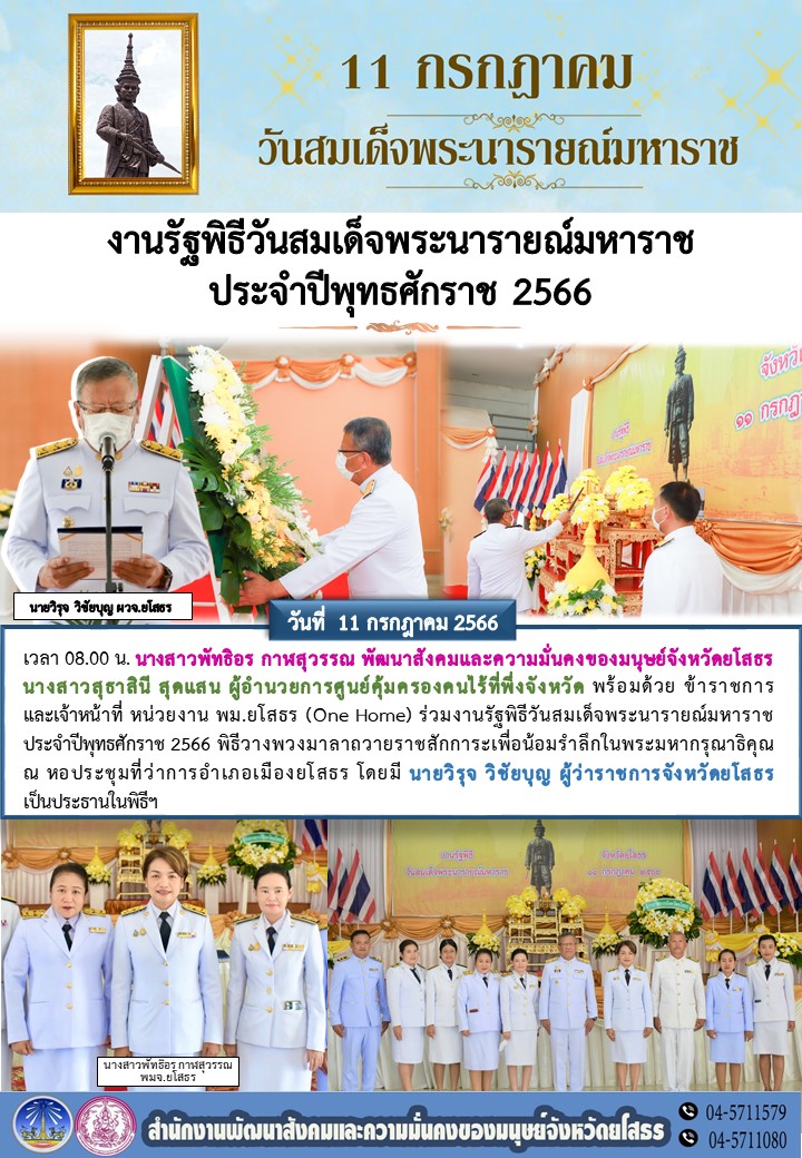 วันที่ 24 ก.ค. 2566 (23:25 น.)วันที่ 11 กรกฎาคม 2566 เวลา 08.00 น. นางสาวพัทธิอร กาฬสุวรรณ พัฒนาสังคมและความมั่นคงของมนุษย์จังหวัดยโสธร นางสาวสุธาสินี สุดแสน ผู้อำนวยการศูนย์คุ้มครองคนไร้ที่พึ่งจังหวัด พร้อมด้วย ข้าราชการ และเจ้าหน้าที่ หน่วยงาน พม.ยโสธร (One Home) ร่วมงานรัฐพิธีวันสมเด็จพระนารายณ์มหาราช ประจำปีพุทธศักราช 2566 พิธีวางพวงมาลาถวายราชสักการะเพื่อน้อมรำลึกในพระมหากรุณาธิคุณ ณ หอประชุมที่ว่าการอำเภอเมืองยโสธร โดยมี นายวิรุจ วิชัยบุญ ผู้ว่าราชการจังหวั่ดยโสธร เป็นประธานในพิธีฯ