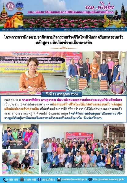 วันที่ 24 ก.ค. 2566 (23:27 น.)วันที่ 11 กรกฎาคม 2566 เวลา 10.30 น. นางสาวพัทธิอร กาฬสุวรรณ พัฒนาสังคมและความมั่นคงของมนุษย์จังหวัดยโสธร เป็นประธานเปิดการฝึกอบรมอาชีพตามกิจกรรมสร้างชีวิตใหม่ให้แก่สตรีและครอบครัว หลักสูตรผลิตภัณฑ์จากเส้นพลาสติก เพื่อเสริมสร้างการมีอาชีพสร้างรายได้ให้แก่ตนเองและครอบครัว ณ ศาลาประชาคมหมู่ 9 ตำบลไผ่ อำเภอทรายมูล โดยได้รับการสนับสนุนการฝึกอบรมอาชีพ จากศูนย์เรียนรู้การพัฒนาสตรีและครอบครัวภาคตะวันออกเฉียงเหนือ จังหวัดศรีสะเกษ