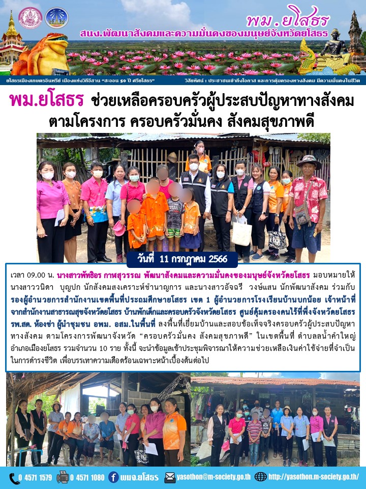 พม.ยโสธร ช่วยเหลือครอบครัวผู้ประสบปัญหา ทางสังคม ตามโครงการพัฒนาจังหวัด “ครอบครัวมั่นคง สังคมสุขภาพดี” (11 กรกฎาคม 2566)