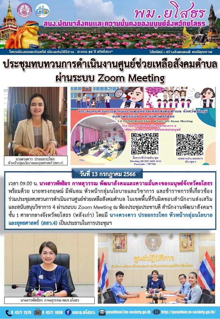 วันที่ 24 ก.ค. 2566 (23:38 น.)วันที่ 13 กรกฎาคม 2566 เวลา 09.00 น. นางสาวพัทธิอร กาฬสุวรรณ พัฒนาสังคมและความมั่นคงของมนุษย์จังหวัดยโสธร พร้อมด้วย นายทรงกฤษณ์ มีพันลม หัวหน้ากลุ่มนโยบายและวิชาการ และข้าราชการที่เกี่ยวข้อง ร่วมประชุมทบทวนการดำเนินงานศูนย์ช่วยเหลือสังคมตำบล ในเขตพื้นที่รับผิดชอบสำนักงานส่งเสริมและสนับสนุนวิชาการ 4 ผ่านระบบ Zoom Meeting ณ ห้องประชุมประชาบดี สำนักงานพัฒนาสังคมฯ ชั้น 1 ศาลากลางจังหวัดยโสธร (หลังเก่า) โดยมี นางดวงดาว ปรอยกระโทก หัวหน้ากลุ่มนโยบายและยุทธศาสตร์ (สสว.4) เป็นประธานในการประชุมฯ