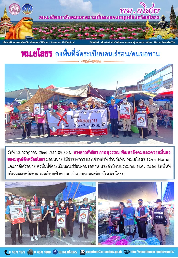 วันที่ 24 ก.ค. 2566 (23:40 น.)วันที่ 13 กรกฎาคม 2566 เวลา 09.30 น. นางสาวพัทธิอร กาฬสุวรรณ พัฒนาสังคมและความมั่นคงของมนุษย์จังหวัดยโสธร มอบหมาย ให้ข้าราชการ และเจ้าหน้าที่ ร่วมกับทีม พม.ยโสธร (One Home) และภาคีเครือข่าย ลงพื้นที่จัดระเบียบคนเร่ร่อน/คนขอทาน ประจำปีงบประมาณ พ.ศ. 2566 ในพื้นที่บริเวณตลาดนัดคลองถมตำบลฟ้าหยาด อำเภอมหาชนะชัย จังหวัดยโสธร