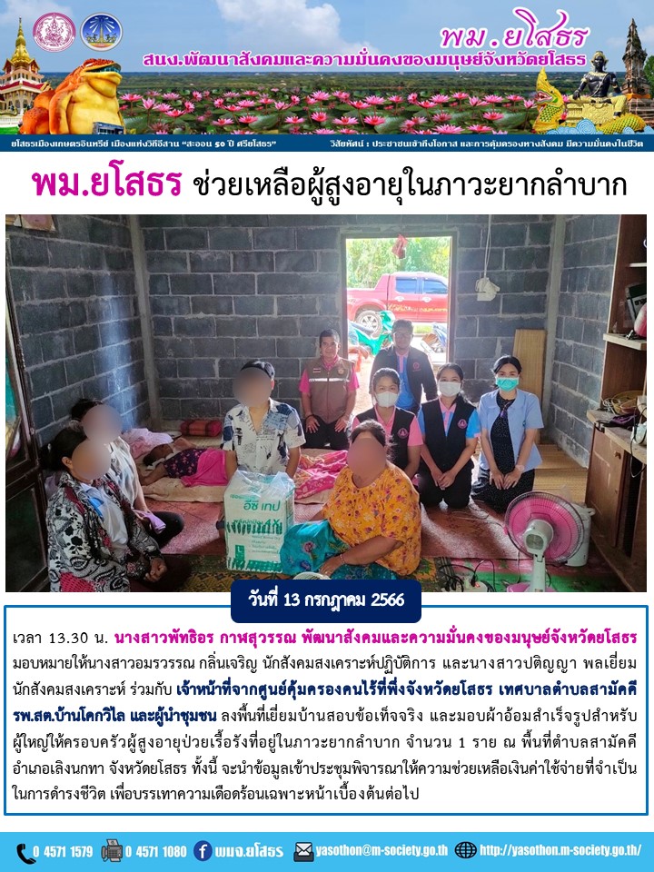 พม.ยโสธร ช่วยเหลือผู้สูงอายุในภาวะยากลำบาก (13 กรกฎาคม 2566)