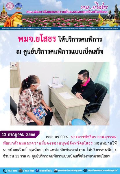 พมจ.ยโสธร ให้บริการคนพิการ ณ ศูนย์บริการคนพิการแบบเบ็ดเสร็จโรงพยาบาลยโสธร (13 กรกฎาคม 2566)