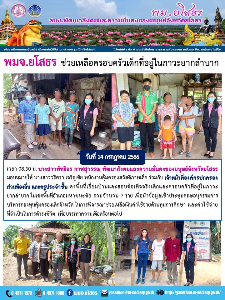 พมจ.ยโสธร ช่วยเหลือครอบครัวเด็กที่อยู่ในภาวะยากลำบาก (14 กรกฎาคม 2566)