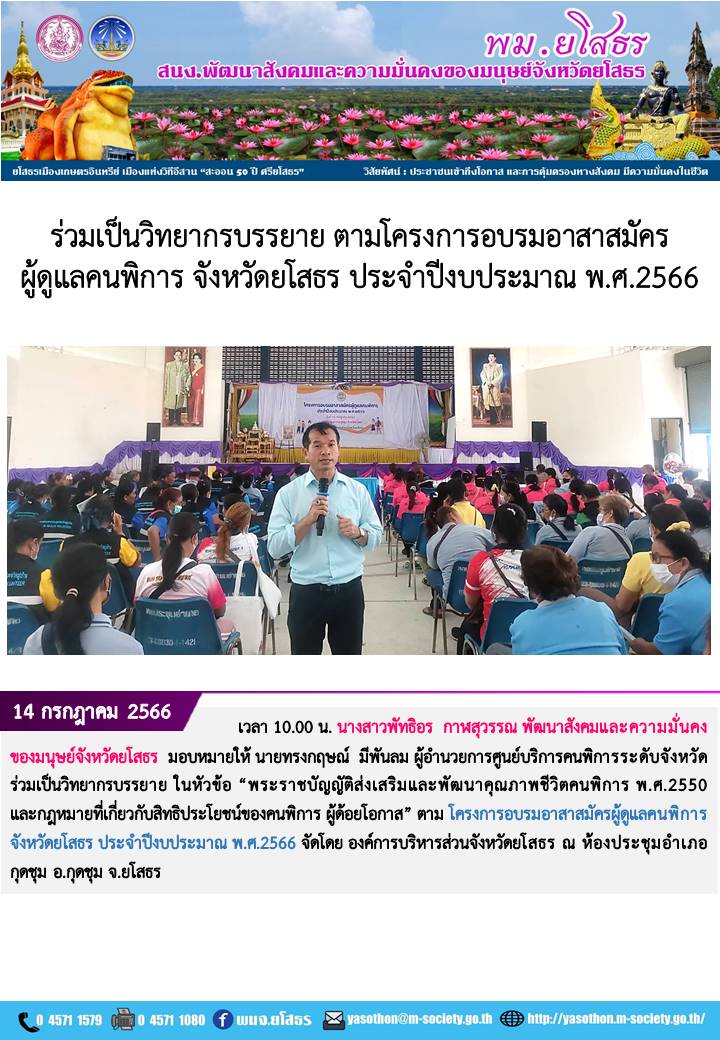 พมจ.ยโสธร ร่วมเป็นวิทยากรบรรยาย ในหัวข้อ “พระราชบัญญัติส่งเสริมและพัฒนาคุณภาพชีวิตคนพิการ พ.ศ.2550 (14 กรกฎาคม 2566)