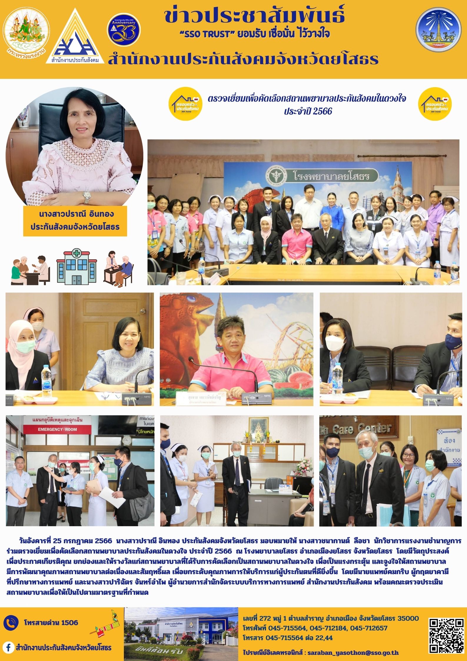 ร่วมตรวจเยี่ยมเพื่อคัดเลือกสถานพยาบาลประกันสังคมในดวงใจ ประจำปี 2566 ณ โรงพยาบาลยโสธร อำเภอเมืองยโสธร จังหวัดยโสธร โดยมีวัตถุประสงค์