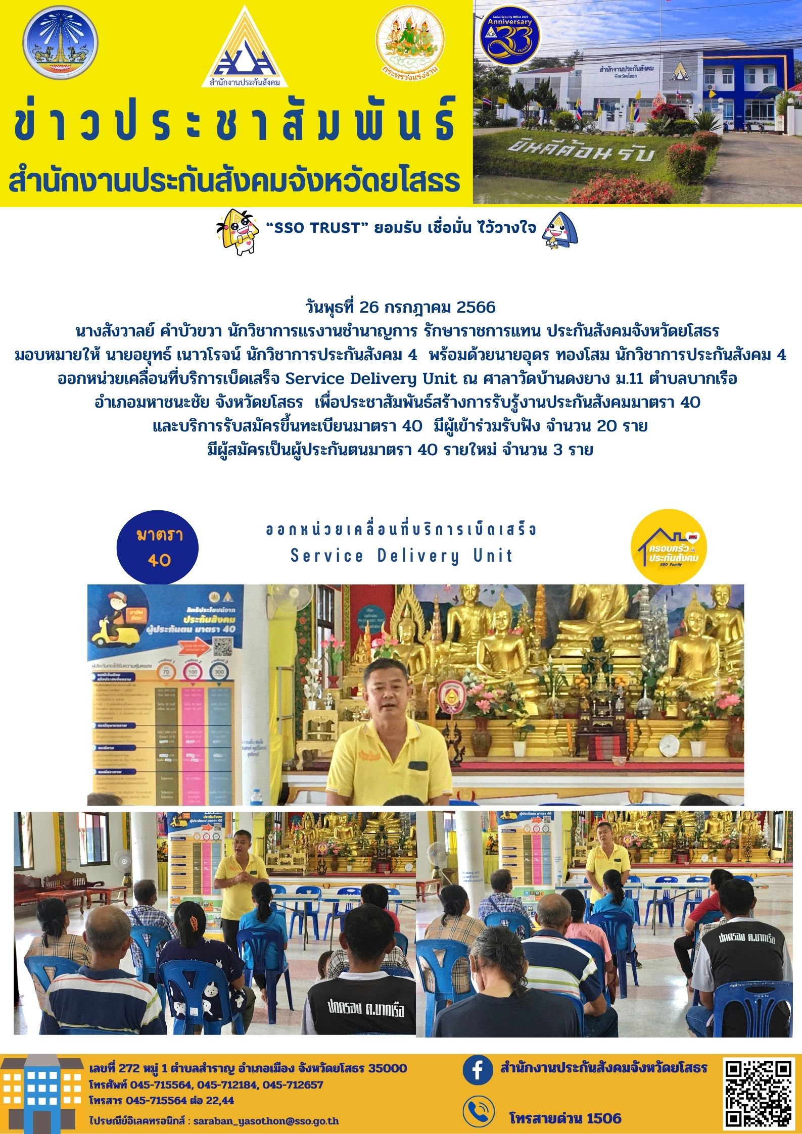 วันพุธที่ 26 กรกฎาคม 2566 นางสังวาลย์ คำบัวขวา นักวิชาการแรงานชำนาญการ รักษาราชการแทน ประกันสังคมจังหวัดยโสธร มอบหมายให้ นายอยุทธ์ เนาวโรจน์ นักวิชาการประกันสังคม 4 พร้อมด้วยนายอุดร ทองโสม นักวิชาการประกันสังคม 4 ออกหน่วยเคลื่อนที่บริการเบ็ดเสร็จ S