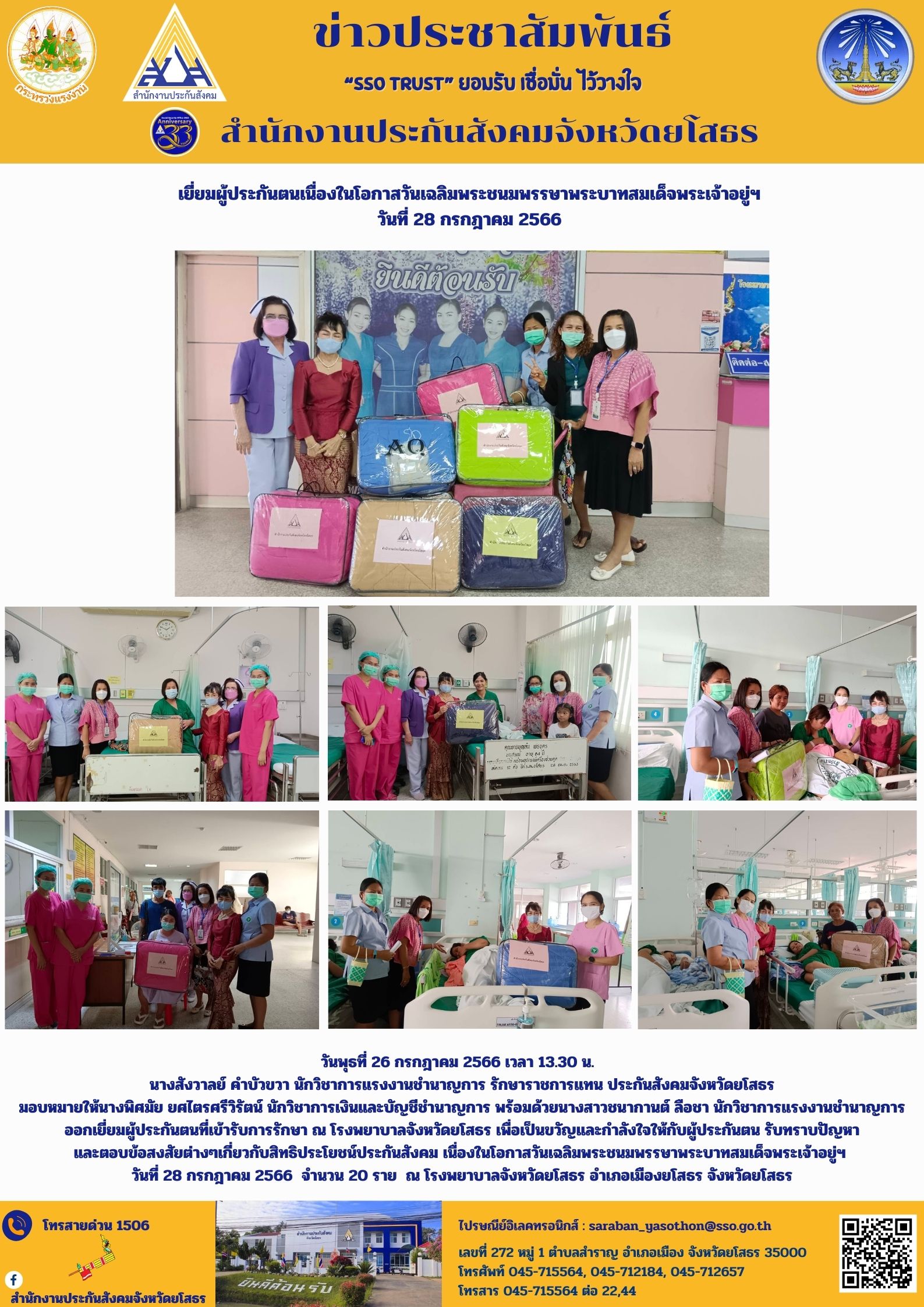 วันพุธที่ 26 กรกฎาคม 2566 เวลา 13.30 น. นางสังวาลย์ คำบัวขวา นักวิชาการแรงงานชำนาญการ รักษาราชการแทน ประกันสังคมจังหวัดยโสธร มอบหมายให้นางพิศมัย ยศไตรศรีวิรัตน์ นักวิชาการเงินและบัญชีชำนาญการ พร้อมด้วยนางสาวชนากานต์ ลือชา นักวิชาการแรงงานชำนาญการ อ