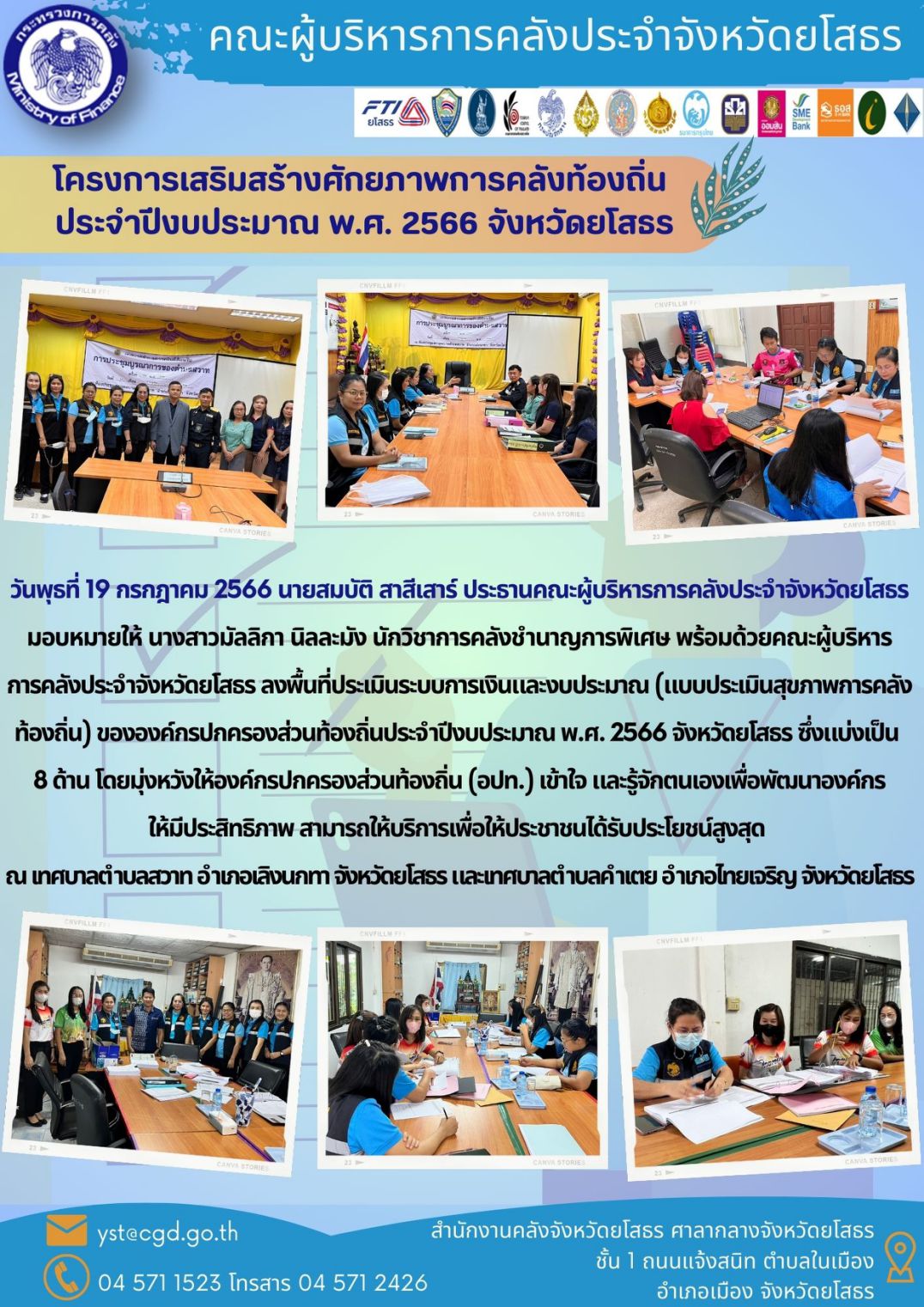 วันพุธที่ 19 กรกฎาคม 2566 นายสมบัติ สาสีเสาร์ ประธานคณะผู้บริหารการคลังประจำจังหวัดยโสธร มอบหมายให้ นางสาวมัลลิกา นิลละมัง นักวิชาการคลังชำนาญการพิเศษ พร้อมด้วยคณะผู้บริหารการคลังประจำจังหวัดยโสธร ลงพื้นที่ประเมินระบบการเงินและงบประมาณ (แบบประเมินสุข