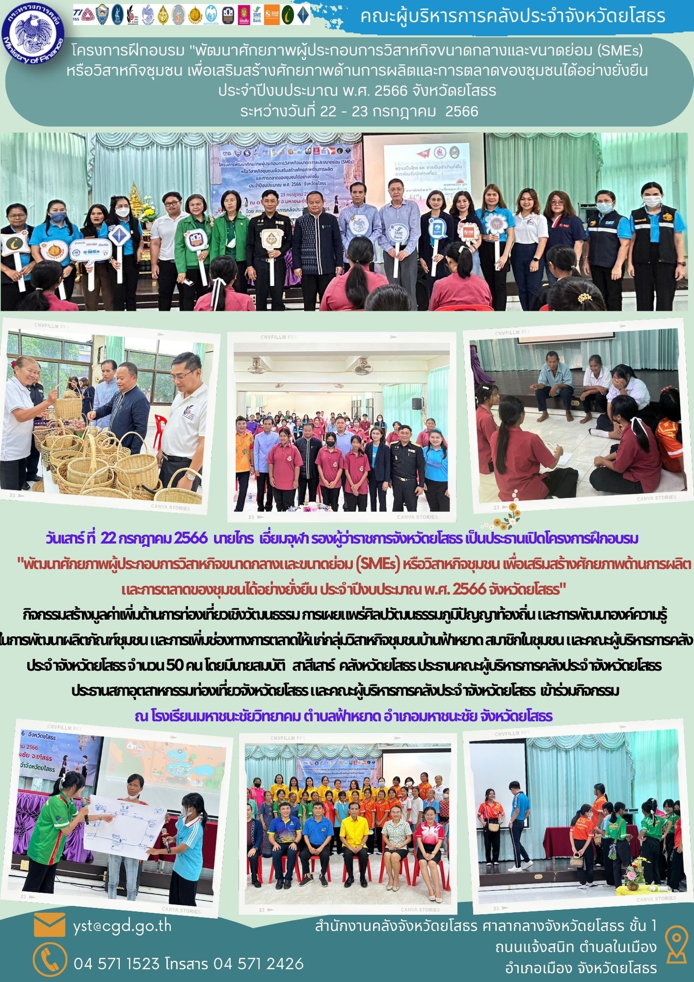 วันเสาร์ ที่ 22 กรกฎาคม 2566 นายไกร เอี่ยมจุฬา รองผู้ว่าราชการจังหวัดยโสธร เป็นประธานเปิดโครงการฝึกอบรม "พัฒนาศักยภาพผู้ประกอบการวิสาหกิจขนาดกลางและขนาดย่อม (SMEs) หรือวิสาหกิจชุมชน เพื่อเสริมสร้างศักยภาพด้านการผลิตและการตลาดของชุมชนได้อย่างยั่งยื