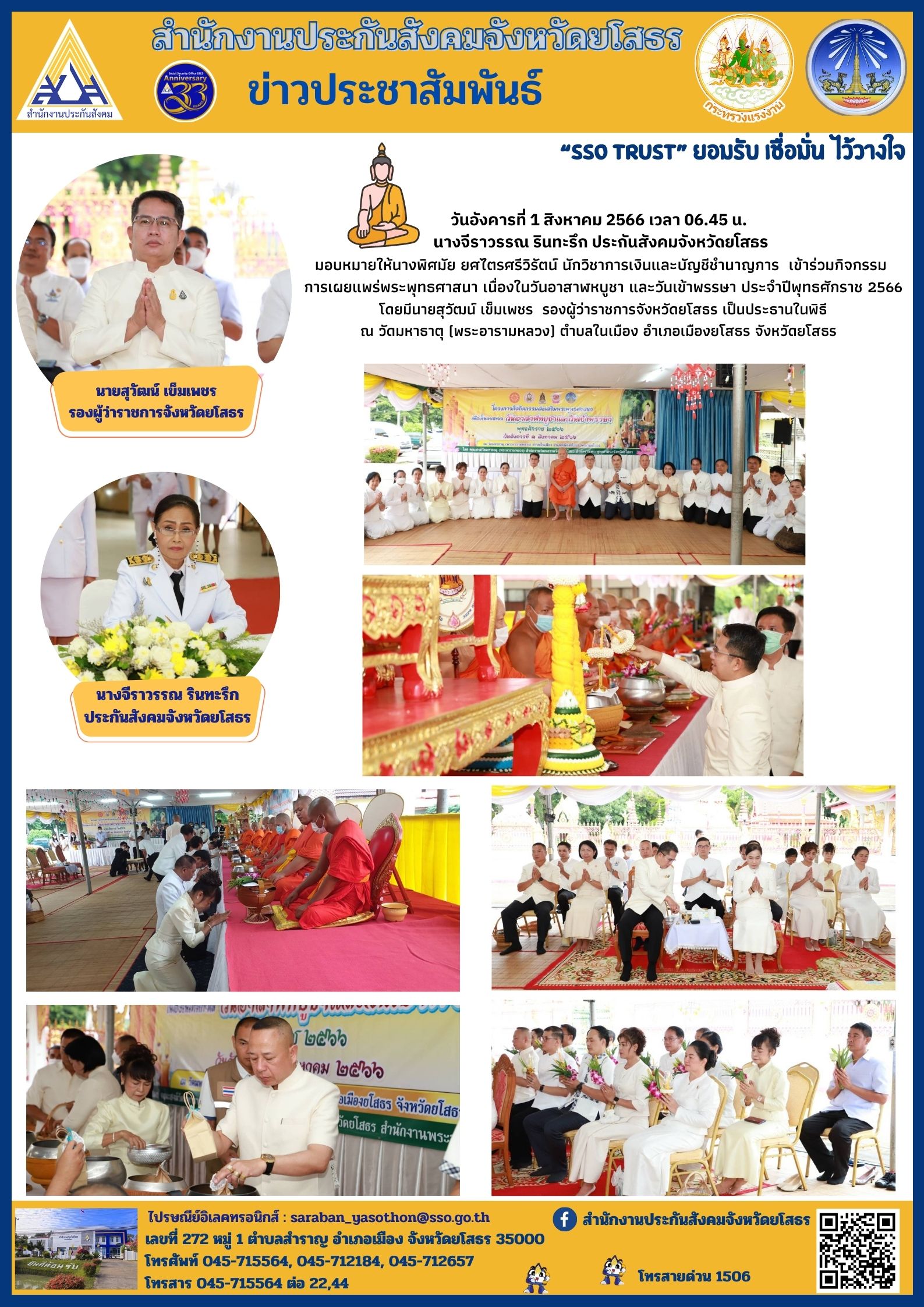 วันอังคารที่ 1 สิงหาคม 2566 เวลา 06.45 น. นางจีราวรรณ รินทะรึก ประกันสังคมจังหวัดยโสธร มอบหมายให้นางพิศมัย ยศไตรศรีวิรัตน์ นักวิชาการเงินและบัญชีชำนาญการ เข้าร่วมกิจกรรม การเผยแพร่พระพุทธศาสนา เนื่องในวันอาสาฬหบูชา และวันเข้าพรรษา ประจำปีพุทธศัก