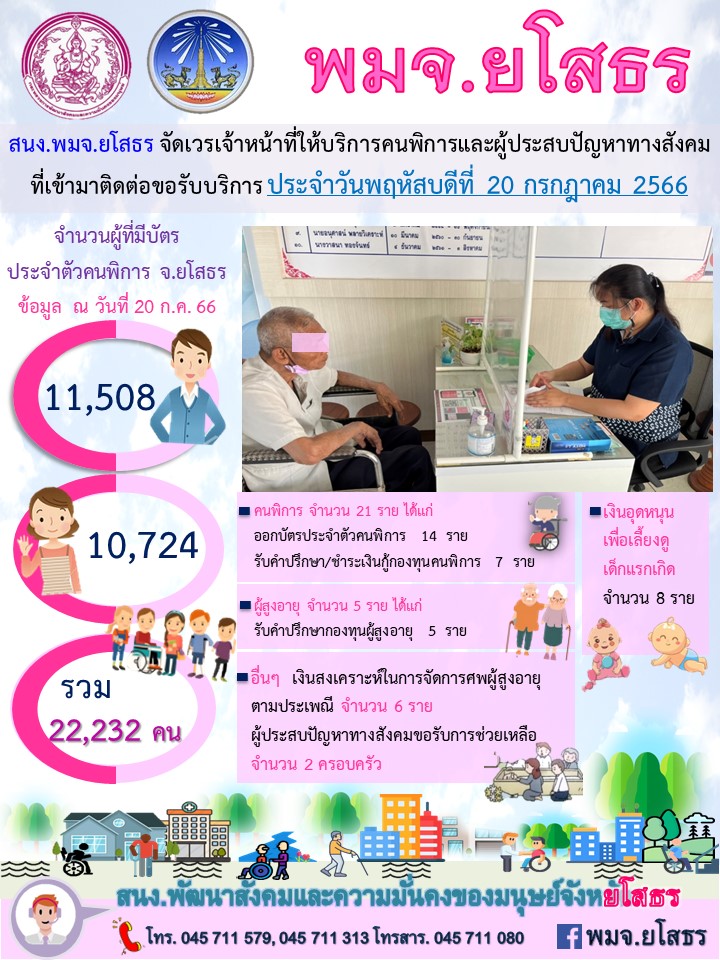 สนง.พมจ.ยโสธร จัดเวรเจ้าหน้าที่ให้บริการคนพิการและผู้ประสบปัญหาทางสังคม ที่เข้ามาติดต่อขอรับบริการ (20 กรกฎาคม 2566)