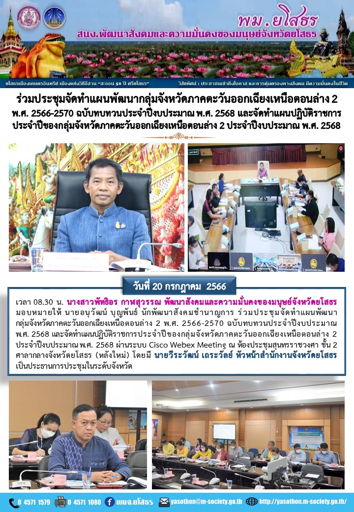ร่วมประชุมจัดทำแผนพัฒนากลุ่มจังหวัดภาคตะวันออกเฉียงเหนือตอนล่าง 2 พ.ศ. 2566-2570 ฉบับทบทวนประจำปีงบประมาณ พ.ศ. 2568 และจัดทำแผนปฏิบัติราชการประจำปีของกลุ่มจังหวัดภาคตะวันออกเฉียงเหนือตอนล่าง 2 (20 กรกฎาคม 2566)