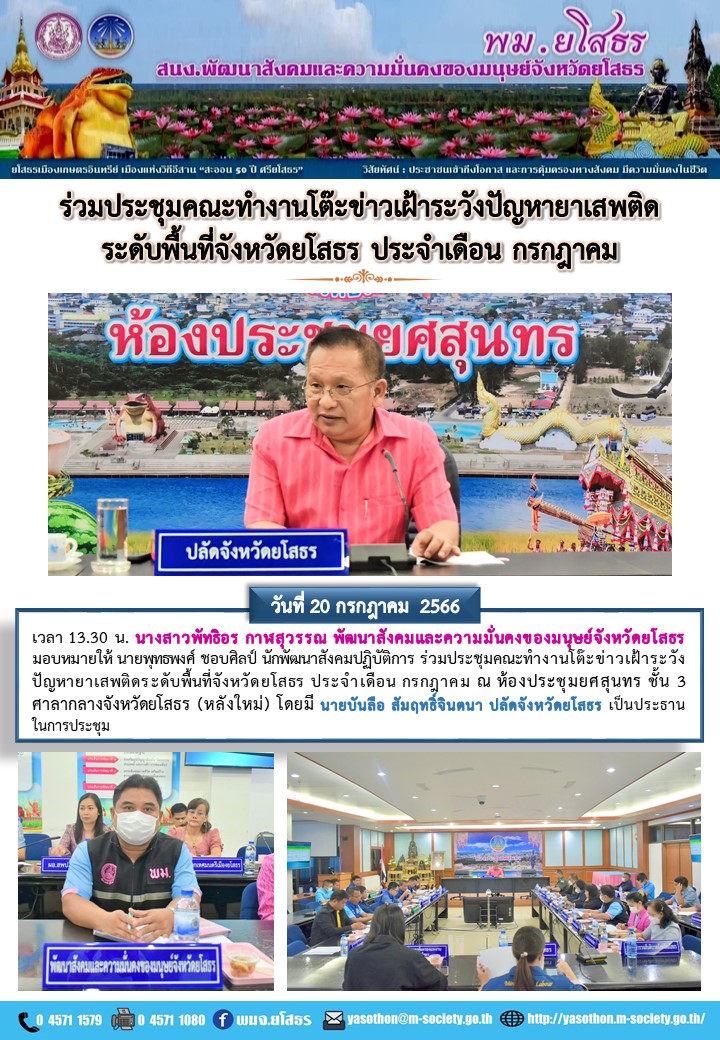ร่วมประชุมคณะทำงานโต๊ะข่าวเฝ้าระวังปัญหายาเสพติดระดับพื้นที่จังหวัดยโสธร ประจำเดือน กรกฎาคม (20 กรกฎาคม 2566 )