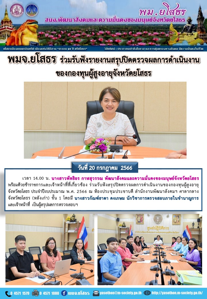 พมจ.ยโสธร ร่วมรับฟังสรุปปิดตรวจผลการดำเนินงานของกองทุนผู้สูงอายุจังหวัดยโสธร ประจำปีงบประมาณ พ.ศ. 2566 (20 กรกฎาคม 2566)