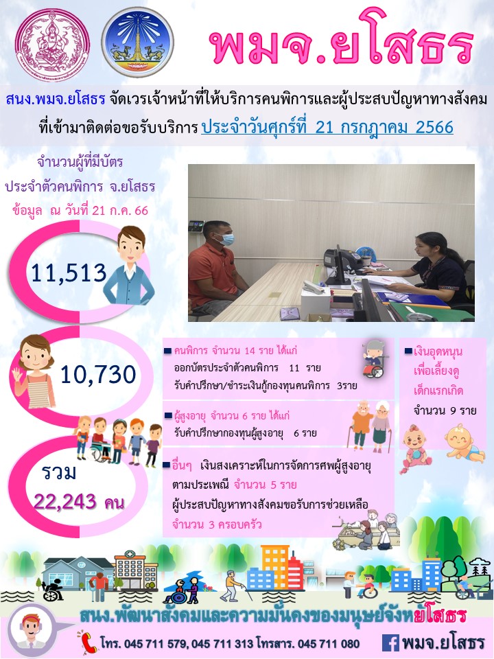 สนง.พมจ.ยโสธร จัดเวรเจ้าหน้าที่ให้บริการคนพิการและผู้ประสบปัญหาทางสังคม ที่เข้ามาติดต่อขอรับบริการ (21 กรกฎาคม 2566)