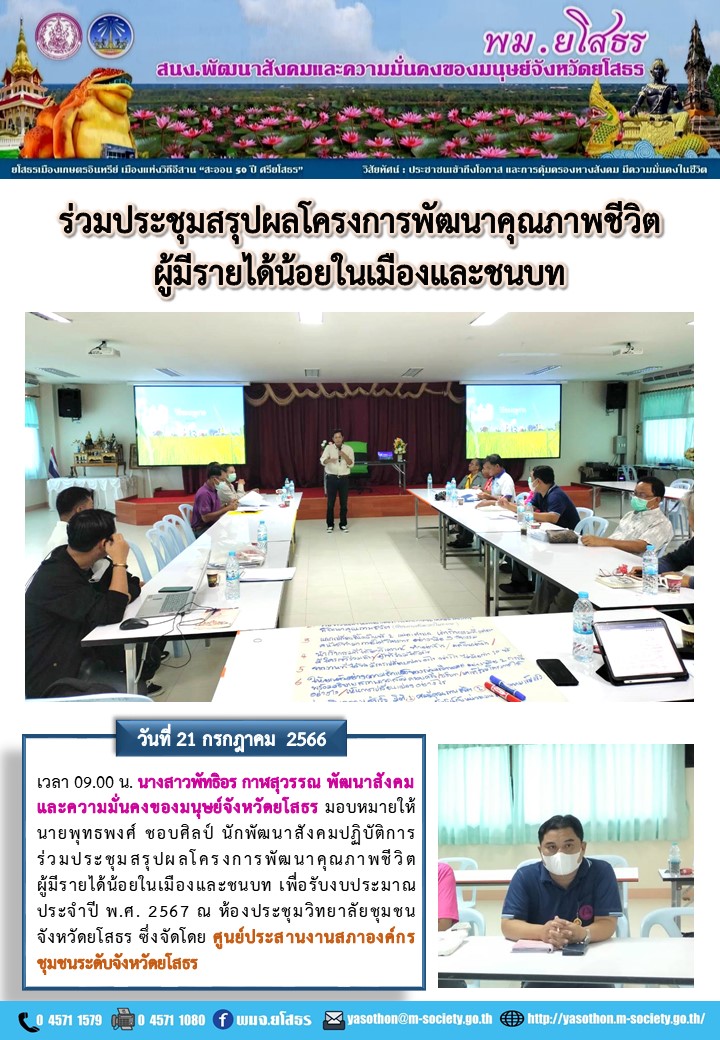 วันที่ 2 ส.ค. 2566 (17:07 น.)วันที่ 21 กรกฎาคม 2566 เวลา 09.00 น. นางสาวพัทธิอร กาฬสุวรรณ พัฒนาสังคมและความมั่นคงของมนุษย์จังหวัดยโสธร มอบหมายให้ นายพุทธพงศ์ ชอบศิลป์ นักพัฒนาสังคมปฏิบัติการ ร่วมประชุมสรุปผลโครงการพัฒนาคุณภาพชีวิตผู้มีรายได้น้อยในเมืองและชนบท เพื่อรับงบประมาณประจำปี พ.ศ. 2567 ณ ห้องประชุมวิทยาลัยชุมชนจังหวัดยโสธร ซึ่งจัดโดย ศูนย์ประสานงานสภาองค์กรชุมชนระดับจังหวัดยโสธร