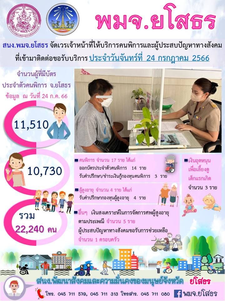 สนง.พมจ.ยโสธร จัดเวรเจ้าหน้าที่ให้บริการคนพิการและผู้ประสบปัญหาทางสังคม ที่เข้ามาติดต่อขอรับบริการ (24 กรกฎาคม 2566)