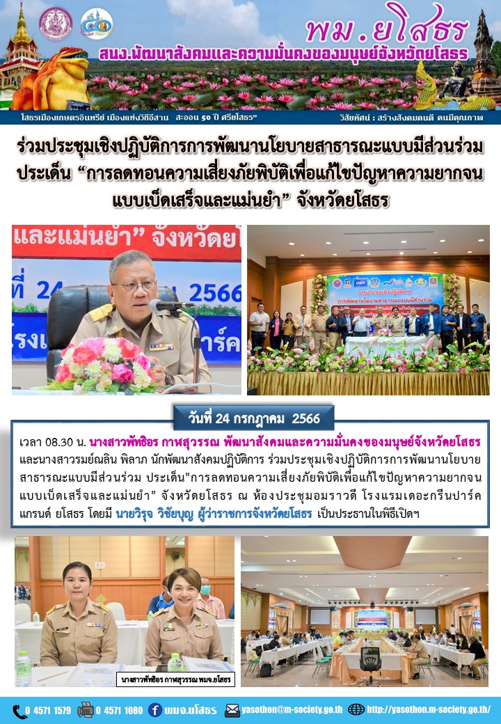 ร่วมประชุมเชิงปฏิบัติการการพัฒนานโยบายสาธารณะแบบมีส่วนร่วม ประเด็น"การลดทอนความเสี่ยงภัยพิบัติเพื่อแก้ไขปัญหาความยากจนแบบเบ็ดเสร็จและแม่นยำ" จังหวัดยโสธร (24 กรกฎาคม 2566)