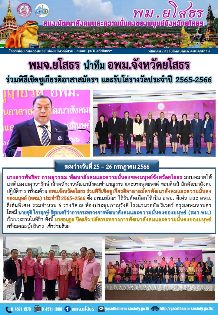 พมจ.ยโสธร นำทีม อพม.จังหวัดยโสธร ร่วมพิธีเชิดชูเกียรติอาสาสมัครฯ และรับโล่รางวัล ประจำปี 2565-2566 (26 กรกฎาคม 2566)