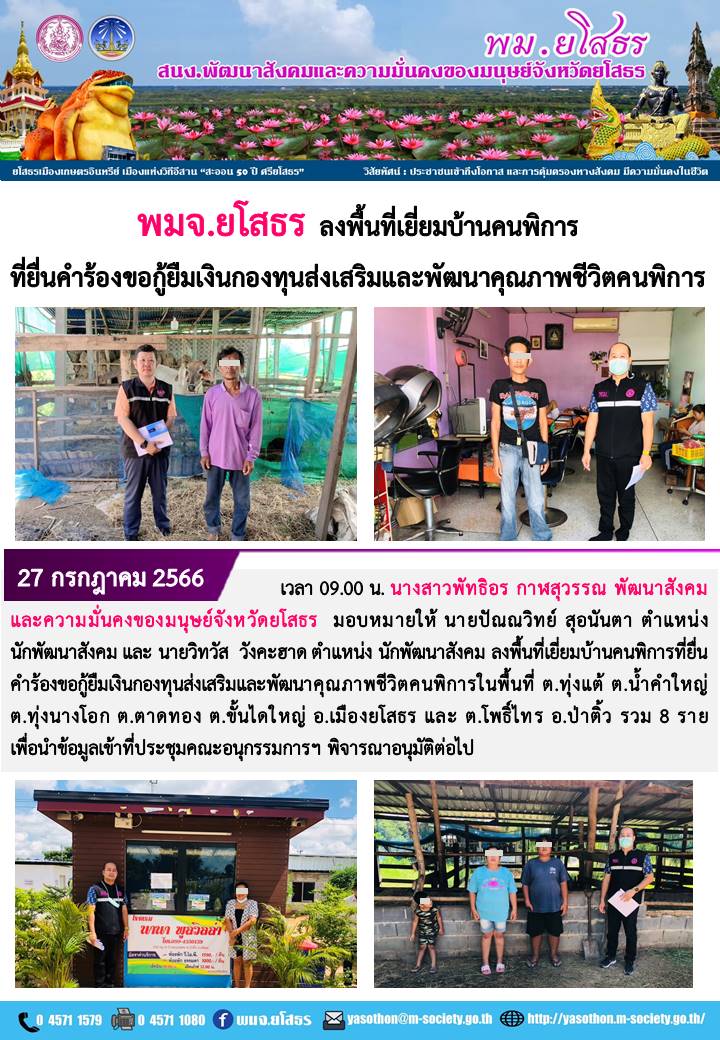 พมจ.ยโสธร ลงพื้นที่เยี่ยมบ้าน คนพิการที่ยื่นคำร้องขอกู้ยืมเงินกองทุนส่งเสริมและพัฒนาคุณภาพชีวิตคนพิการ (2ุ7 กรกฎาคม 2566)