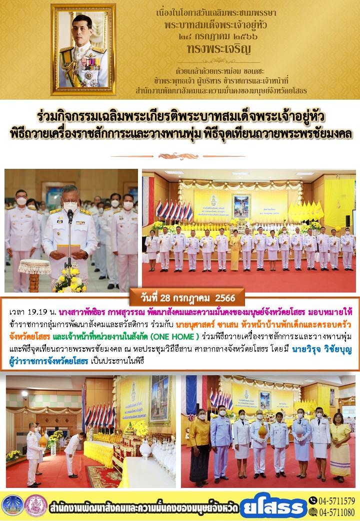 วันที่ 2 ส.ค. 2566 (22:42 น.)วันที่ 28 กรกฎาคม 2566 เวลา 19.19 น. นางสาวพัทธิอร กฬสุวรรณ พัฒนาสังคมและความมั่นคงชองมนุษย์จังหวัดยโสธร มอบหมายให้ ข้าราชการกลุ่มการพัฒนา สังคมและสวัสดิการ ร่วมกับ นายนุศาสตร์ ซาเสน หัวหน้าบ้านพักเด็กและครอบครัว จังหวัดยโสธร และเจ้าหน้าที่หน่วยงานในสังกัด (ONE HOME ) ร่วมพิธีภวายเครื่องราชสักกระและวางพานพุ่มและพิธีจุดเทียนถวายพระพรชัยมงคล ณ หอประชุมวิถีอีสาน ศาลากลางจังหวัดยโสธร โดยมี นายวิรุจ วิชัยบุญ ผู้ว่าราชการจังหวัดยโสธร เป็นประธานในพิธี