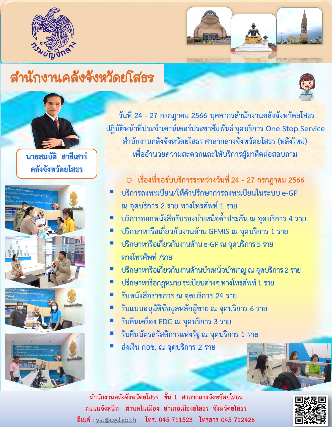 วันที่ 24 - 27 กรกฎาคม 2566 บุคลากรสำนักงานคลังจังหวัดยโสธร ปฏิบัติหน้าที่ประจำเคาน์เตอร์ประชาสัมพันธ์ จุดบริการ One Stop Service สำนักงานคลังจังหวัดยโสธร ศาลากลางจังหวัดยโสธร (หลังใหม่) เพื่ออำนวยความสะดวกและให้บริการผู้มาติดต่อสอบถาม
