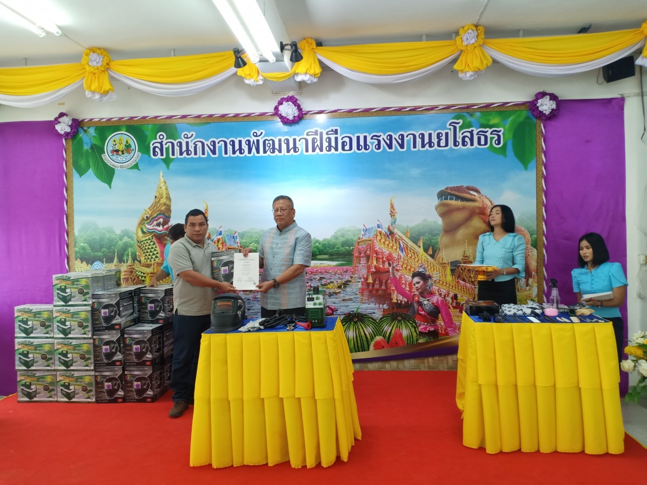 สสค.ยโสธร ร่วมพิธีมอบชุดเครื่องมือทำมาหากินให้กับผู้ผ่านการฝึกอบรม หลักสูตร ช่างแต่งผมบุรุษ และหลักสูตร การเชื่อมประกอบผลิตภัณฑ์