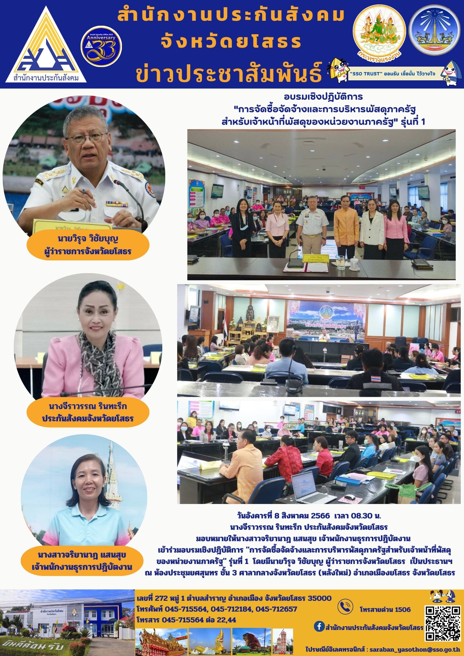 วันอังคารที่ 8 สิงหาคม 2566 เวลา 08.30 น. นางจีราวรรณ รินทะรึก ประกันสังคมจังหวัดยโสธร มอบหมายให้นางสาวจริยานาฎ แสนสุข เจ้าพนักงานธุรการปฎิบัตงาน เข้าร่วมอบรมเชิงปฎิบัติการ "การจัดซื้อจัดจ้างและการบริหารพัสดุภาครัฐสำหรับเจ้าหน้าที่พัสดุ ของห