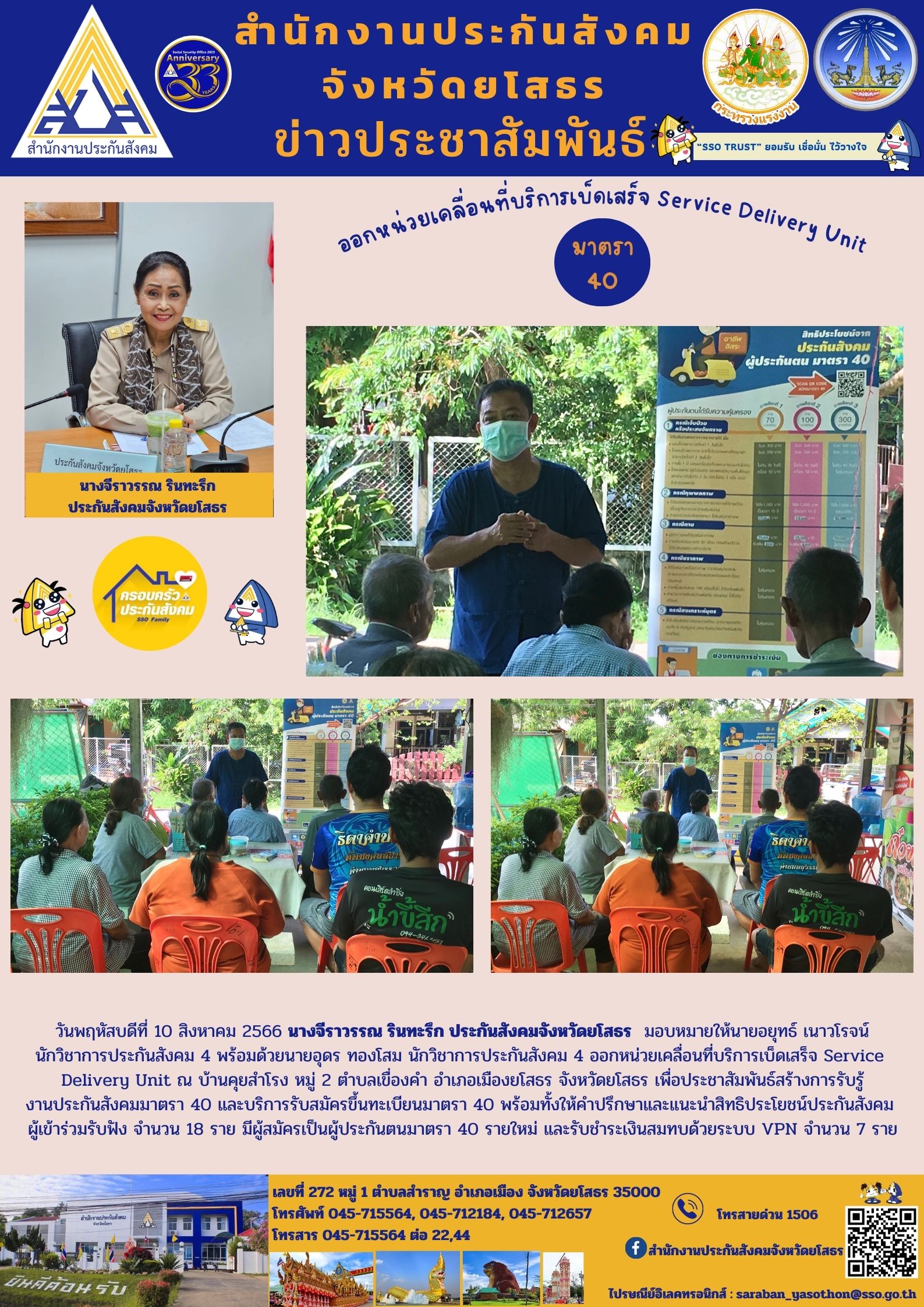 ประกันสังคมจังหวัดยโสธร มอบหมายให้เจ้าหน้าที่ออกประชาสัมพันธ์งานประกันสังคมมาตรา 40ณ บ้านคุยสำโรง หมู่ 2 ตำบลเขื่องคำ อำเภอเมืองยโสธร จังหวัดยโสธร เพื่อประชาสัมพันธ์สร้างการรับรู้ งานประกันสังคมมาตรา 40 และบริการรับสมัครขึ้นทะเบียนมาตรา 40