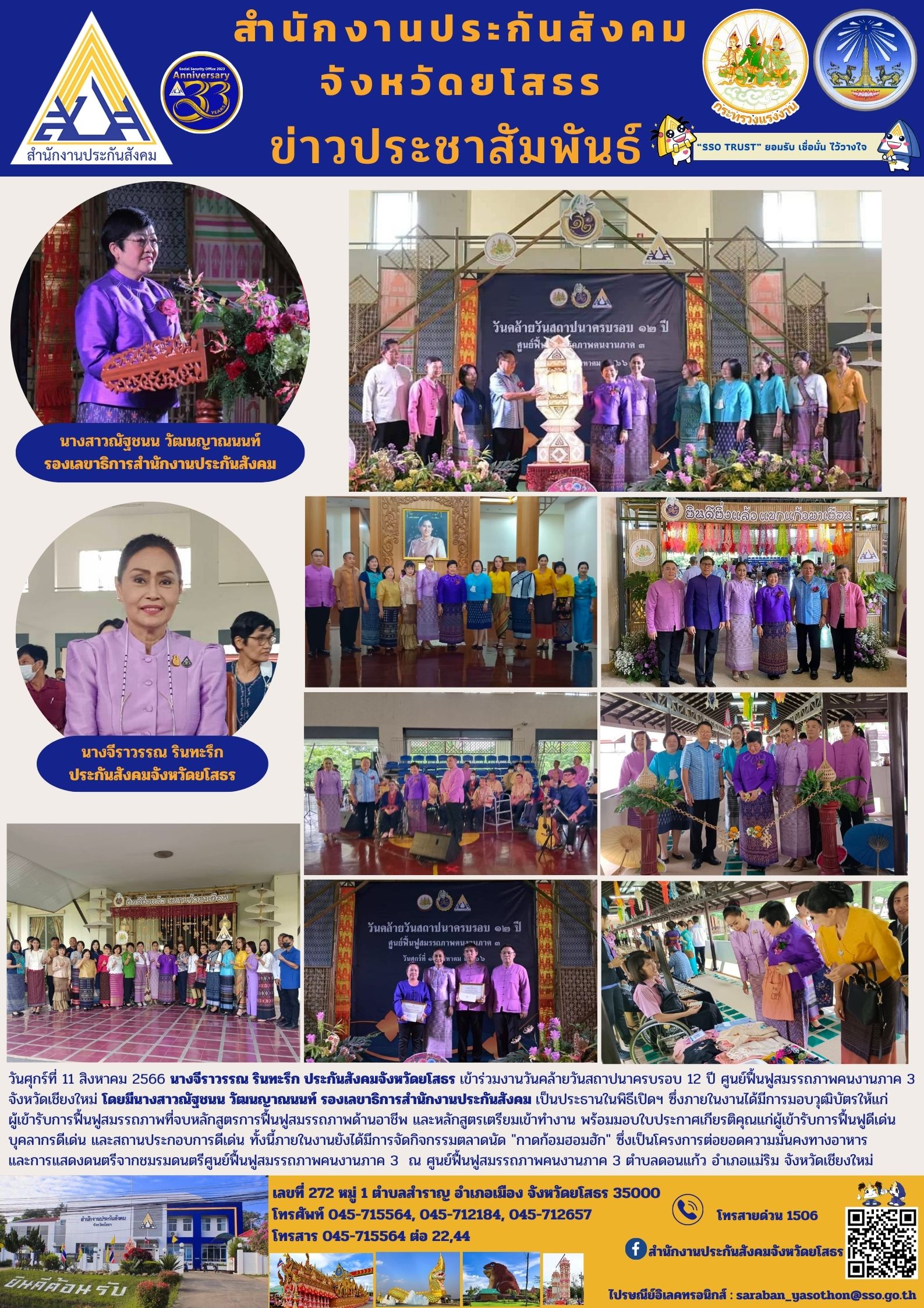 วันศุกร์ที่ 11 สิงหาคม 2566 นางจีราวรรณ รินทะรึก ประกันสังคมจังหวัดยโสธร เข้าร่วมงานวันคล้ายวันสถาปนาครบรอบ 12 ปี ศูนย์ฟื้นฟูสมรรถภาพคนงานภาค 3