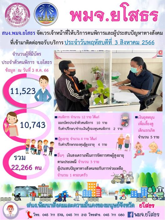 สนง.พมจ.ยโสธร จัดเวรเจ้าหน้าที่ให้บริการคนพิการและผู้ประสบปัญหาทางสังคม ที่เข้ามาติดต่อขอรับบริการ (3 สิงหาคม 2566)