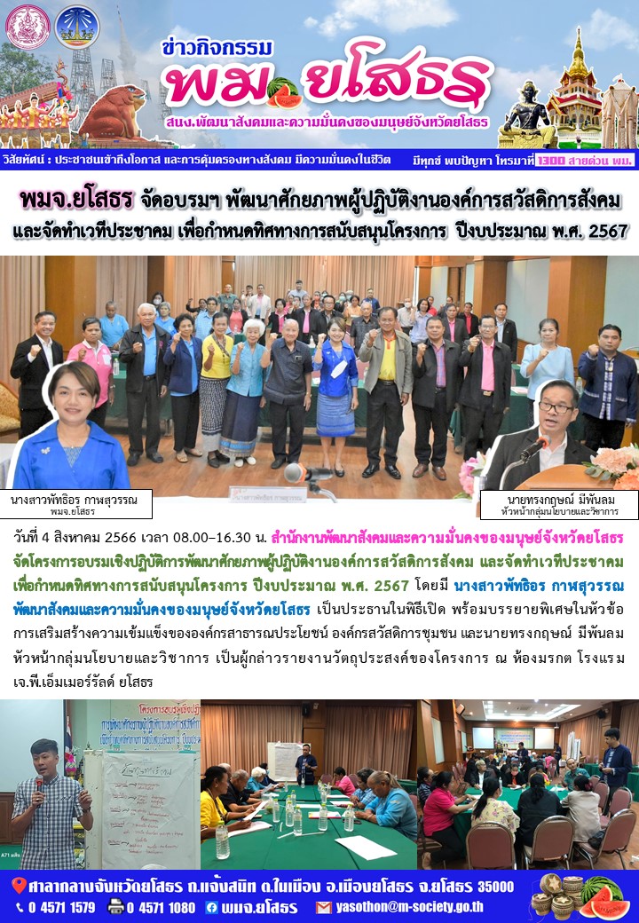 วันที่ 15 ส.ค. 2566 (21:46 น.)วันที่ 4 สิงหาคม 2566 เวลา 08.00–16.30 น. สำนักงานพัฒนาสังคมและความมั่นคงของมนุษย์จังหวัดยโสธร จัดโครงการอบรมเชิงปฏิบัติการพัฒนาศักยภาพผู้ปฏิบัติงานองค์การสวัสดิการสังคม และจัดทำเวทีประชาคมเพื่อกำหนดทิศทางการสนับสนุนโครงการ ปีงบประมาณ พ.ศ. 2567 โดยมี นางสาวพัทธิอร กาฬสุวรรณ พัฒนาสังคมและความมั่นคงของมนุษย์จังหวัดยโสธร เป็นประธานในพิธีเปิด พร้อมบรรยายพิเศษในหัวข้อการเสริมสร้างความเข้มแข็งขององค์กรสาธารณประโยชน์ องค์กรสวัสดิการชุมชน และนายทรงกฤษณ์ มีพันลม หัวหน้ากลุ่มนโยบายและวิชาการ เป็นผู้กล่าวรายงานวัตถุประสงค์ของโครงการ ณ ห้องมรกต โรงแรม เจ.พี.เอ็มเมอร์รัลด์ ยโสธร
