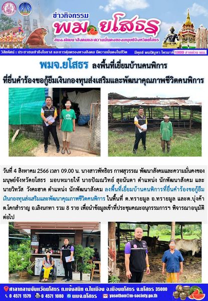 วันที่ 15 ส.ค. 2566 (21:50 น.)วันที่ 4 สิงหาคม 2566 เวลา 09.00 น. นางสาวพัทธิอร กาฬสุวรรณ พัฒนาสังคมและความมั่นคงของมนุษย์จังหวัดยโสธร มอบหมายให้ นายปัณณวิทย์ สุอนันตา ตำแหน่ง นักพัฒนาสังคม และนายวิทวัส วังคะฮาด ตำแหน่ง นักพัฒนาสังคม ลงพื้นที่เยี่ยมบ้านคนพิการที่ยื่นคำร้องขอกู้ยืมเงินกองทุนส่งเสริมและพัฒนาคุณภาพชีวิตคนพิการ ในพื้นที่ ต.ทรายมูล อ.ทรายมูล และต.บุ่งค้า ต.โคกสำราญ อ.เลิงนกทา รวม 8 ราย เพื่อนำข้อมูลเข้าที่ประชุมคณะอนุกรรมการฯ พิจารณาอนุมัติต่อไป