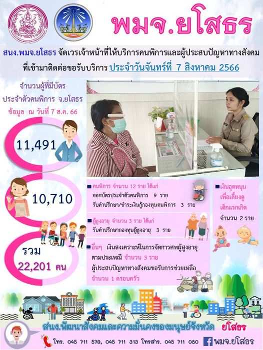 สนง.พมจ.ยโสธร จัดเวรเจ้าหน้าที่ให้บริการคนพิการและผู้ประสบปัญหาทางสังคม ที่เข้ามาติดต่อขอรับบริการ (7 สิงหาคม 2565)