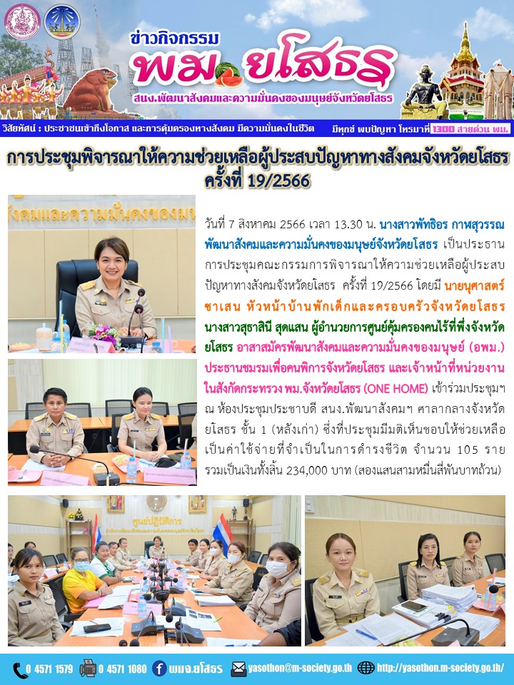 การประชุมคณะกรรมการพิจารณาให้ความช่วยเหลือผู้ประสบปัญหาทางสังคมจังหวัดยโสธร ครั้งที่ 19/2566 (7 สิงหาคม 2566)